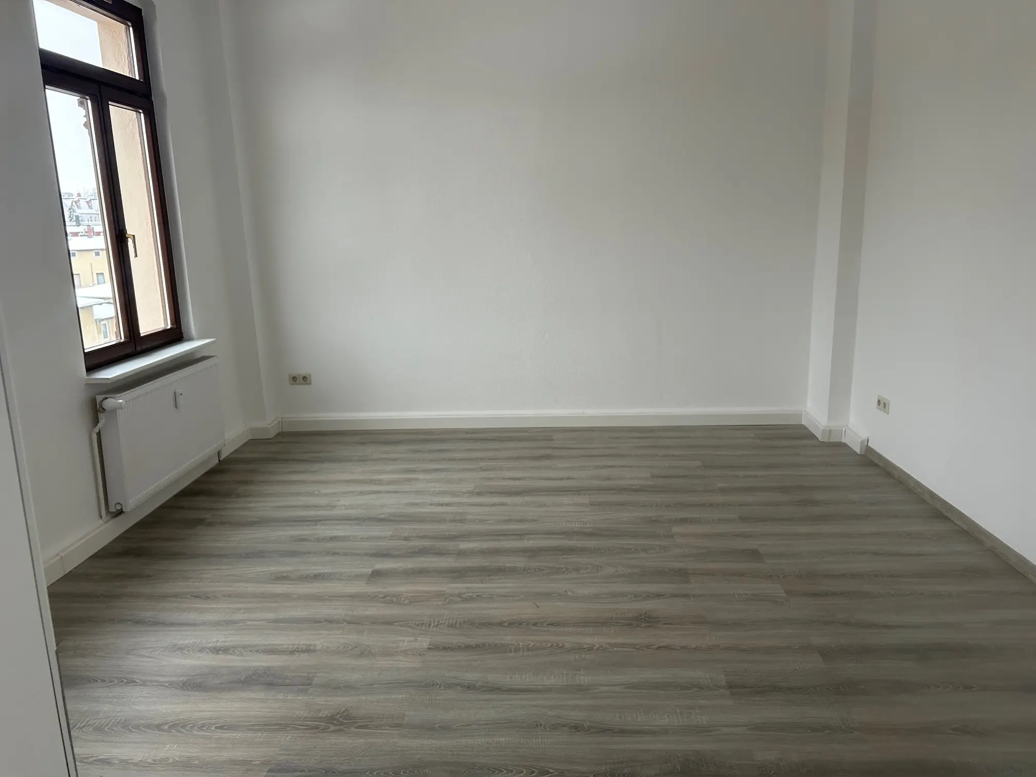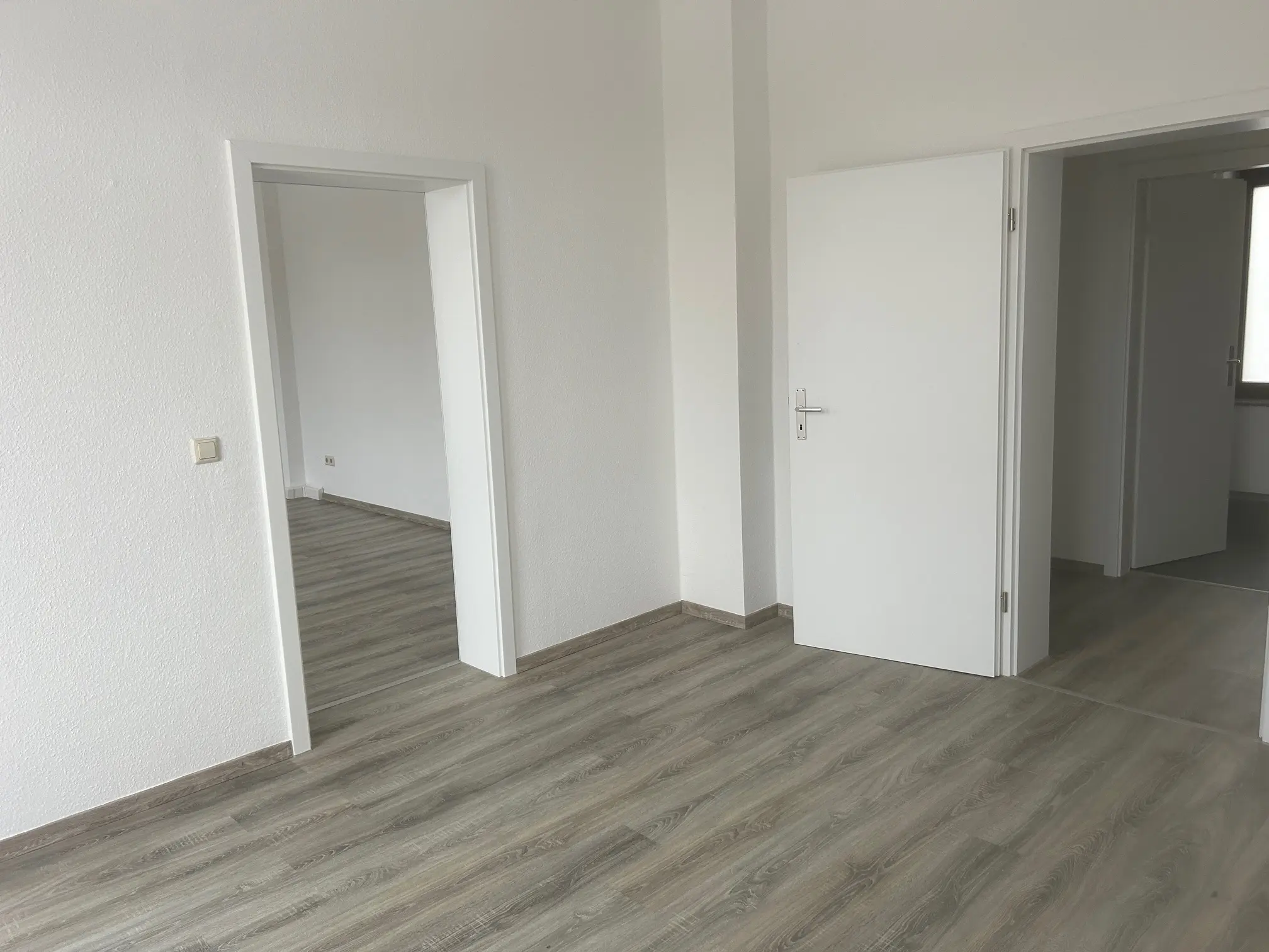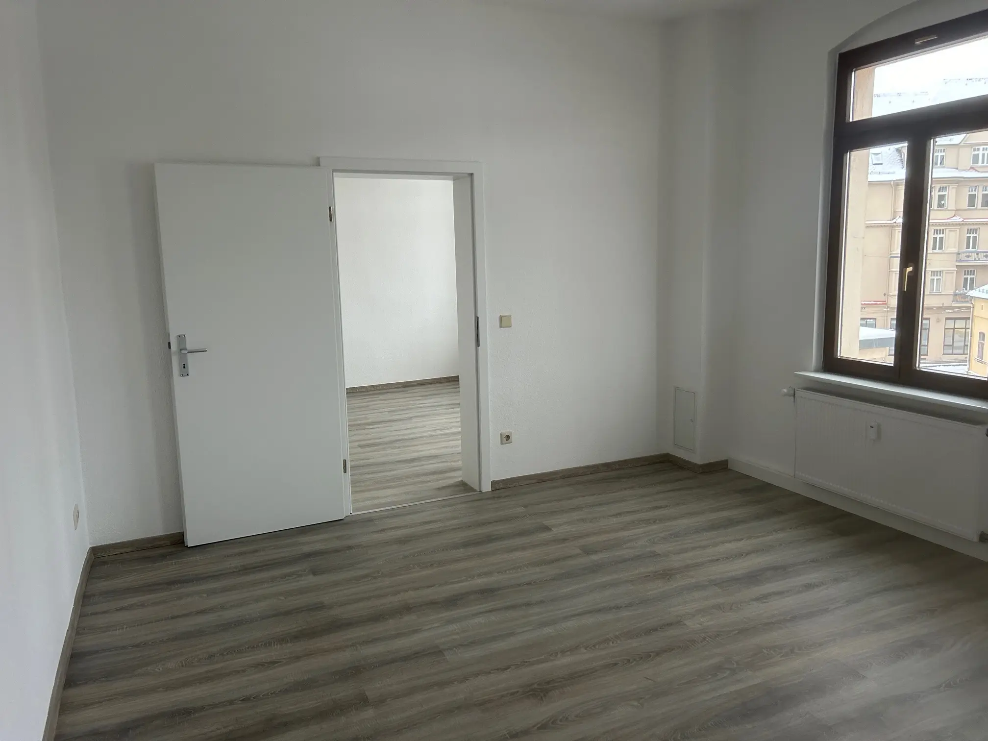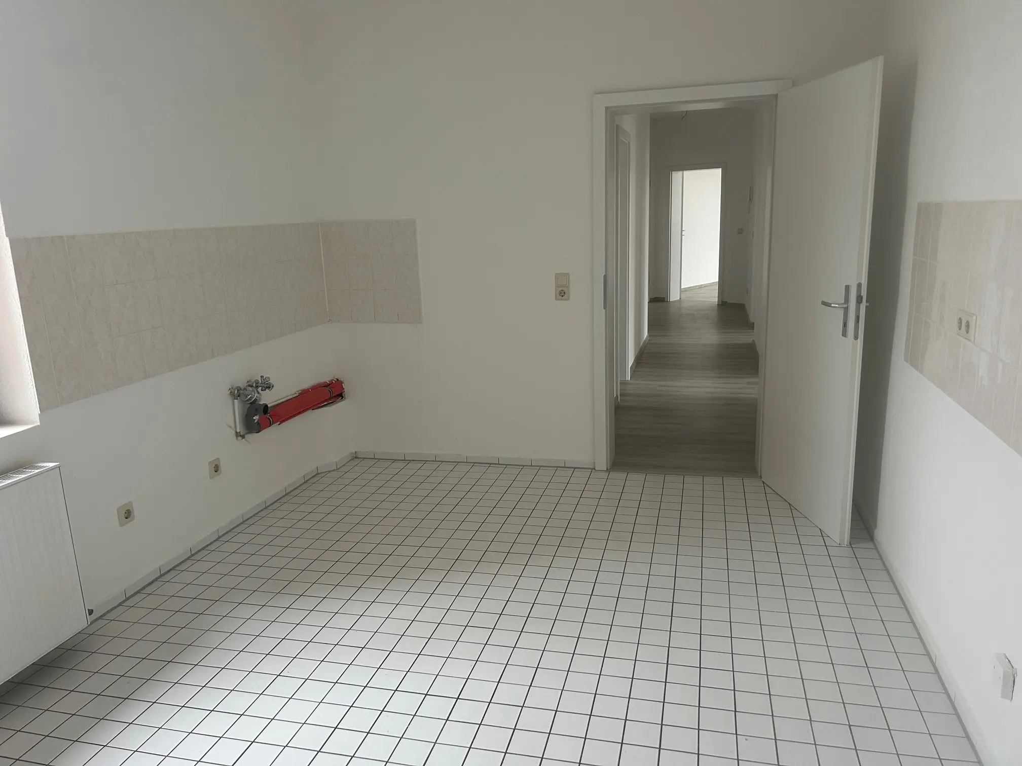 Sie betreten die frisch renovietre 4-Raum Wohnung, Die Wohn- und Schlafräume sind mit optisch schickem Laminat verlegt. Ein Balkon befundet sich am Durchgangszimmer, weöches zum Schlafzimmer führt. Das Balkonzimmer ist aslo ideal für ein Gäste- und/oder Arbeitszimmer geeignet. Ein gr0ßes Wohnzimmer, hell und schön geschnitten verfügt über einen Erker. Alle Wände sind mit Raufaser weiß Tapete ausgestattet, die Innentüren sind ebenfalls weiß und hell. Am Ende des geräumigen Flurs befindet sich die großzügige Wohnküche mit Fliesenboden, Fliesenspiegel und Fenstern zum Innenhof, welche vom Treppenhaus begangen und genutzt werden kann. Ein Tageslichtbad mit Wanne, Platz für Ihre Waschmaschine und Handtuchheizkörper rundet das Wohnungsangebot ab.