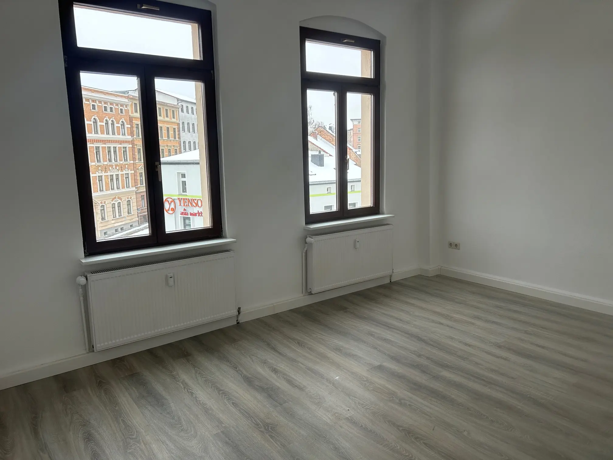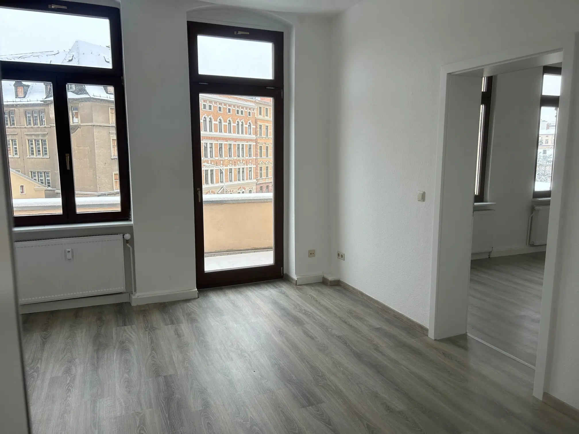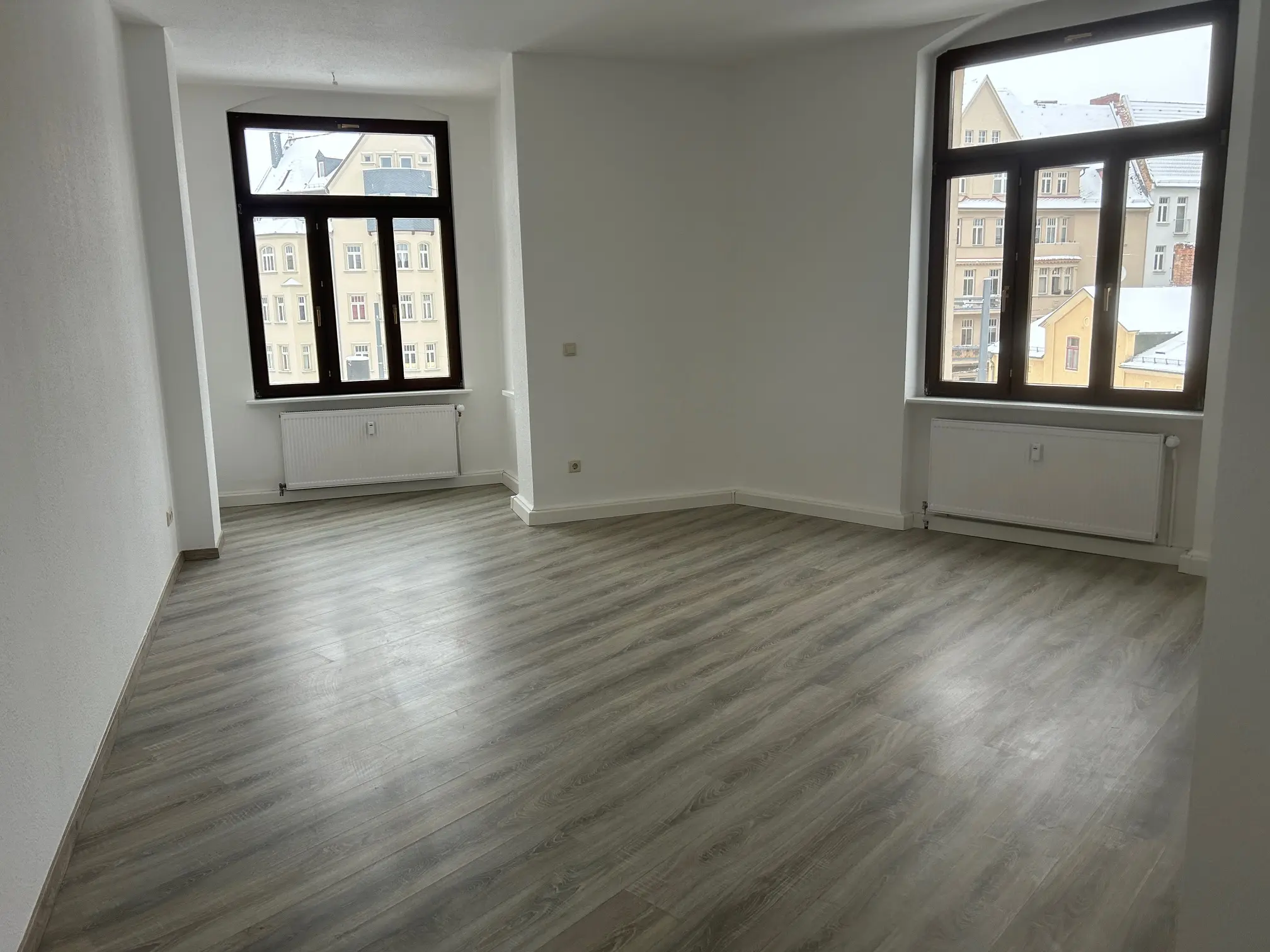 Sie betreten die frisch renovietre 4-Raum Wohnung, Die Wohn- und Schlafräume sind mit optisch schickem Laminat verlegt. Ein Balkon befundet sich am Durchgangszimmer, weöches zum Schlafzimmer führt. Das Balkonzimmer ist aslo ideal für ein Gäste- und/oder Arbeitszimmer geeignet. Ein gr0ßes Wohnzimmer, hell und schön geschnitten verfügt über einen Erker. Alle Wände sind mit Raufaser weiß Tapete ausgestattet, die Innentüren sind ebenfalls weiß und hell. Am Ende des geräumigen Flurs befindet sich die großzügige Wohnküche mit Fliesenboden, Fliesenspiegel und Fenstern zum Innenhof, welche vom Treppenhaus begangen und genutzt werden kann. Ein Tageslichtbad mit Wanne, Platz für Ihre Waschmaschine und Handtuchheizkörper rundet das Wohnungsangebot ab.