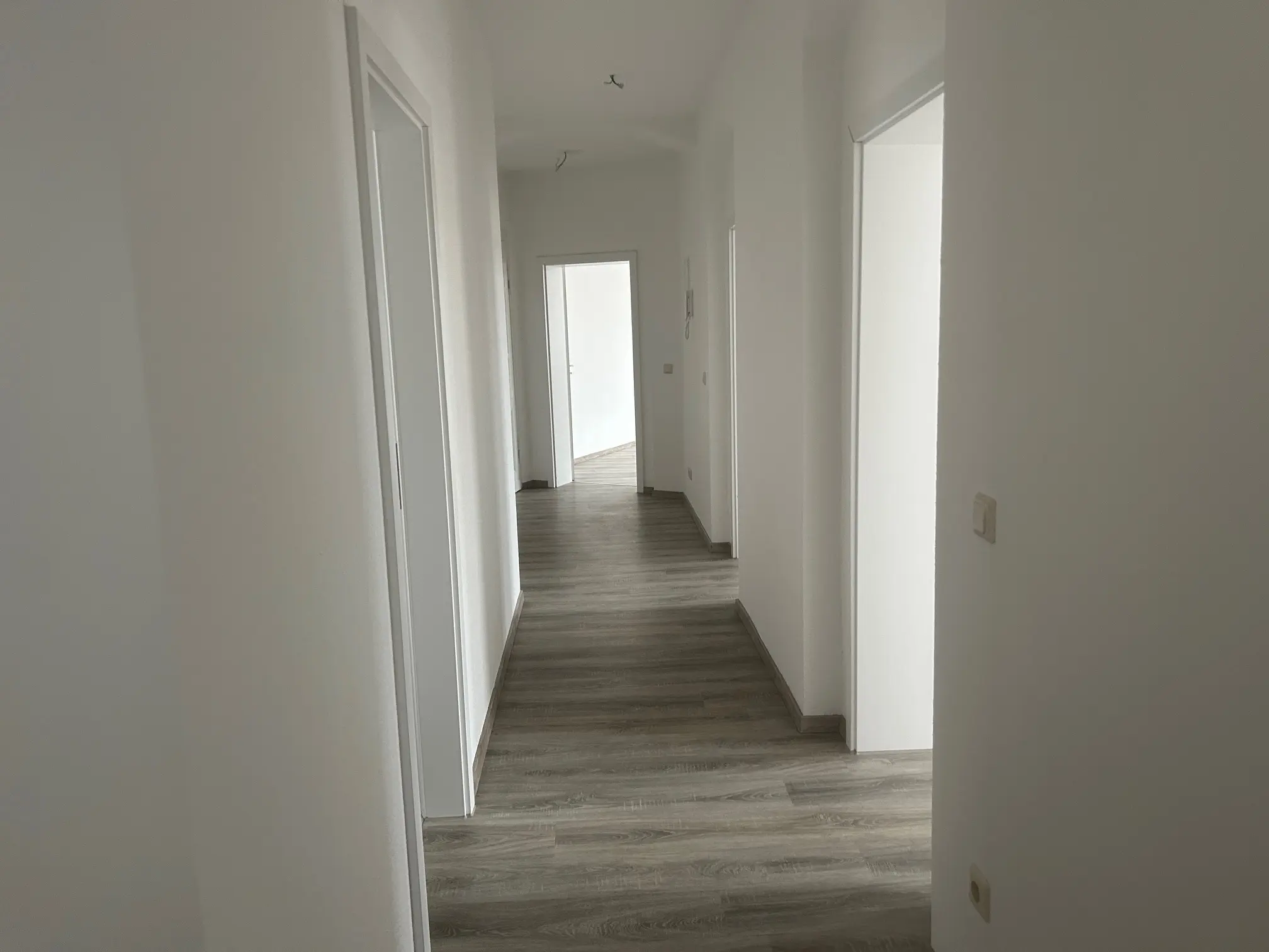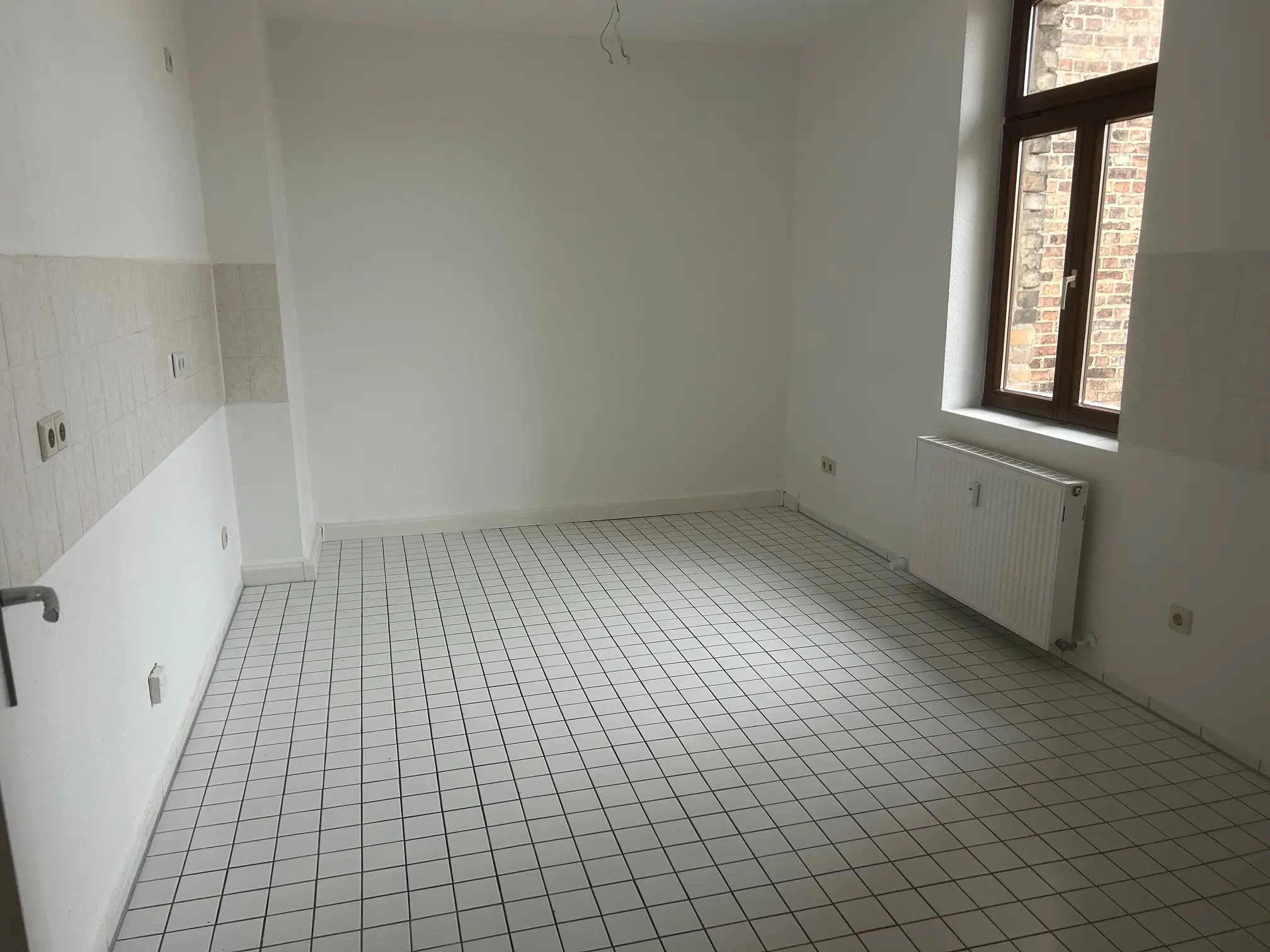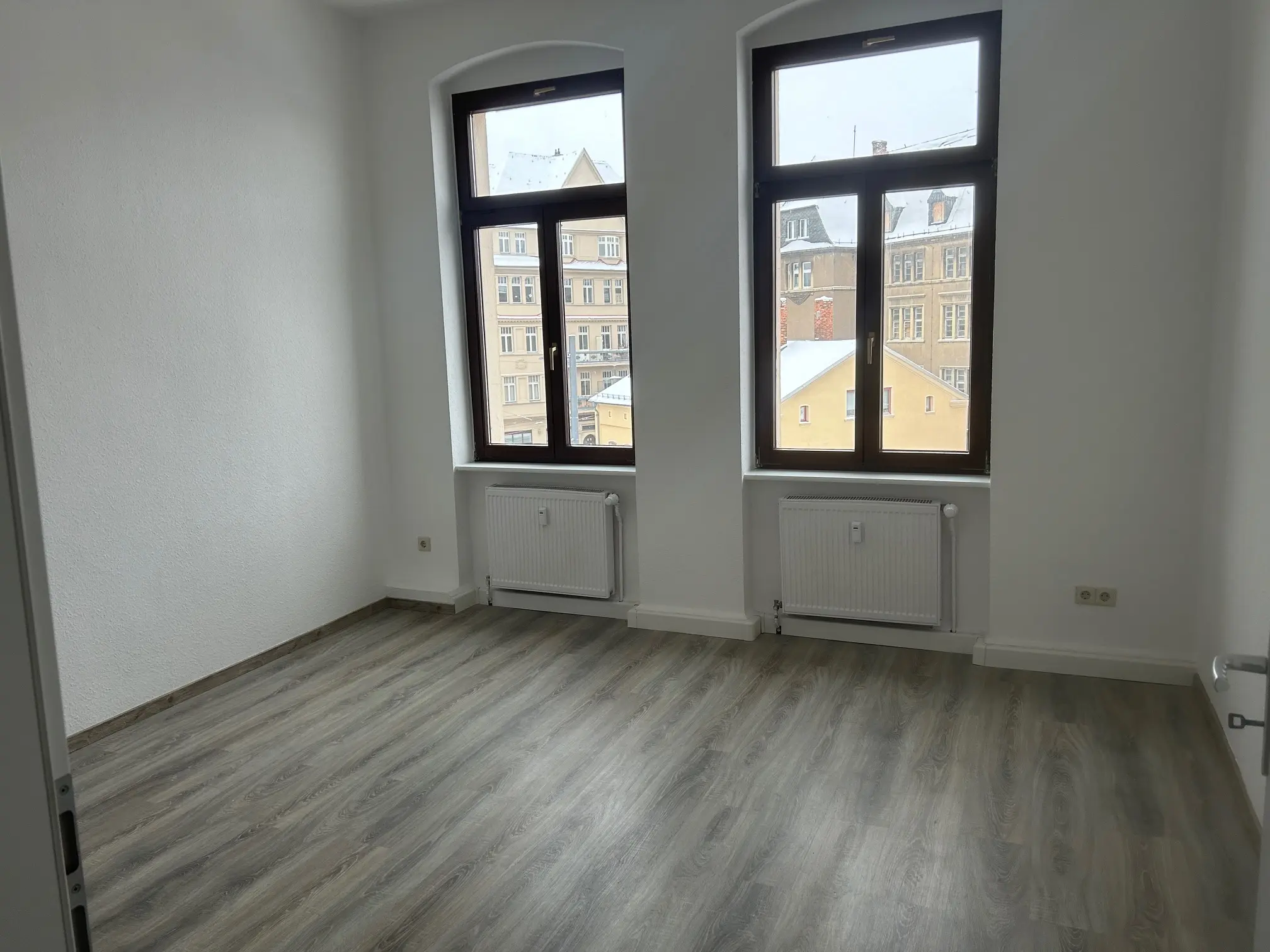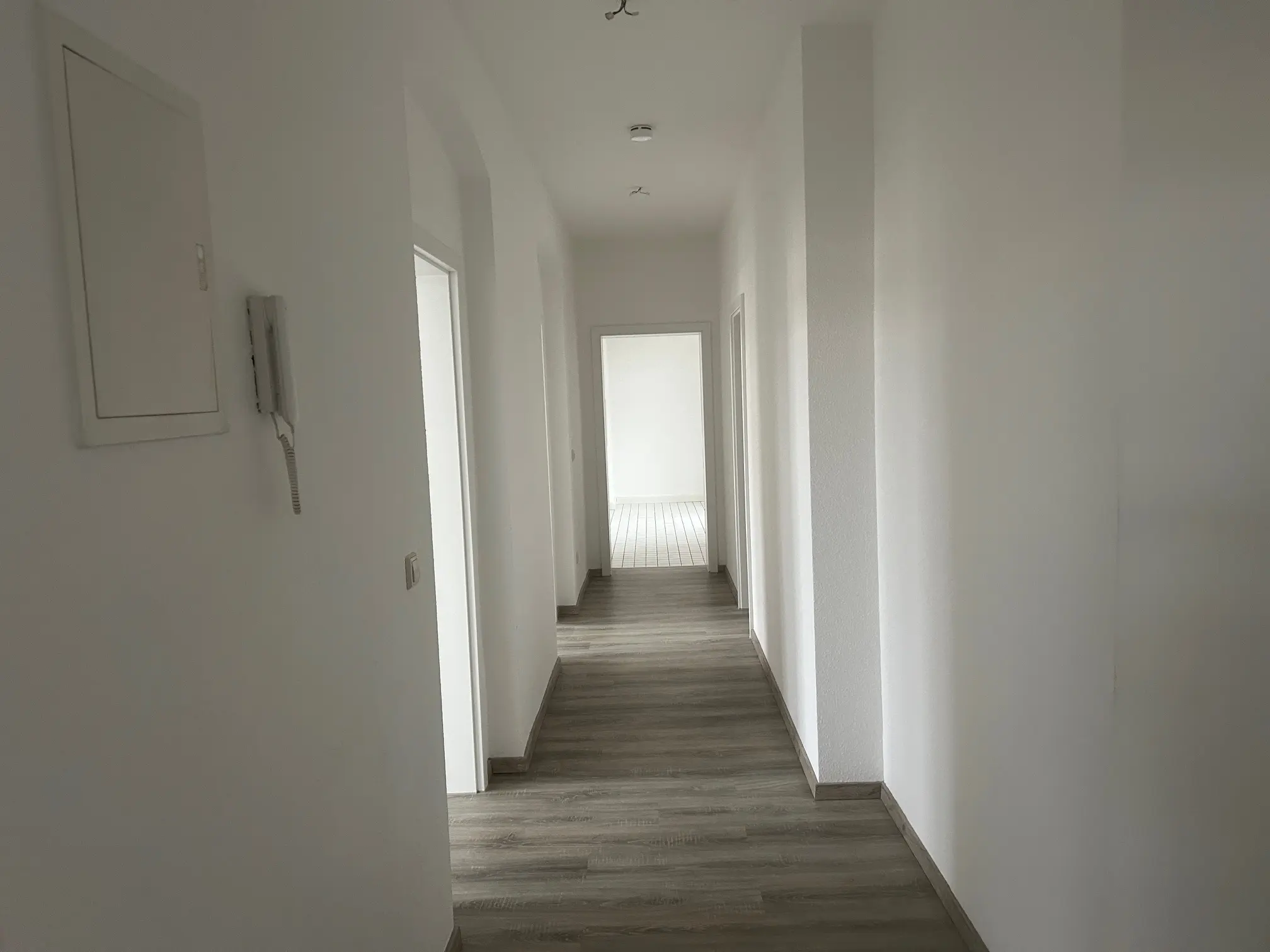 Sie betreten die frisch renovietre 4-Raum Wohnung, Die Wohn- und Schlafräume sind mit optisch schickem Laminat verlegt. Ein Balkon befundet sich am Durchgangszimmer, weöches zum Schlafzimmer führt. Das Balkonzimmer ist aslo ideal für ein Gäste- und/oder Arbeitszimmer geeignet. Ein gr0ßes Wohnzimmer, hell und schön geschnitten verfügt über einen Erker. Alle Wände sind mit Raufaser weiß Tapete ausgestattet, die Innentüren sind ebenfalls weiß und hell. Am Ende des geräumigen Flurs befindet sich die großzügige Wohnküche mit Fliesenboden, Fliesenspiegel und Fenstern zum Innenhof, welche vom Treppenhaus begangen und genutzt werden kann. Ein Tageslichtbad mit Wanne, Platz für Ihre Waschmaschine und Handtuchheizkörper rundet das Wohnungsangebot ab.