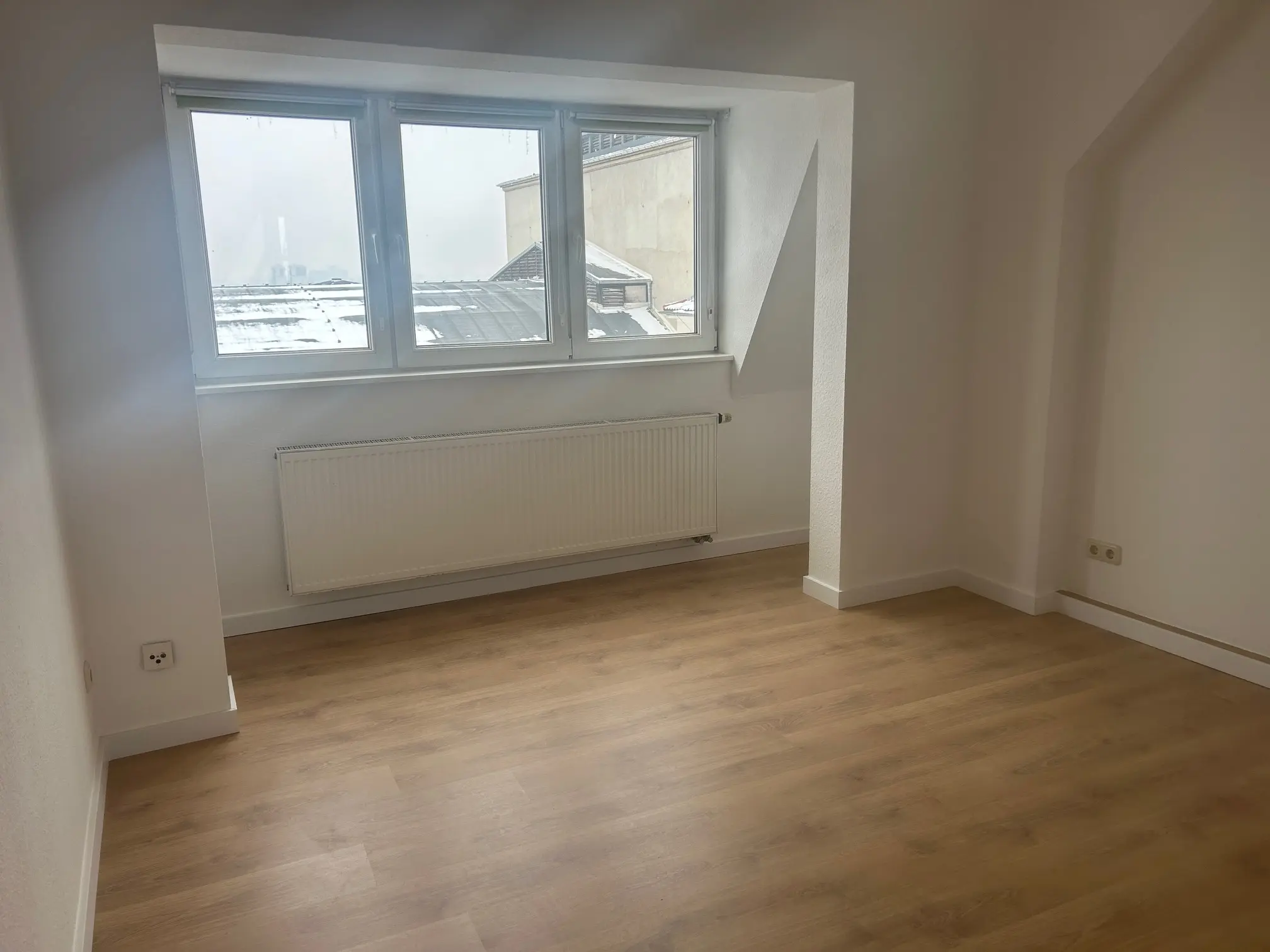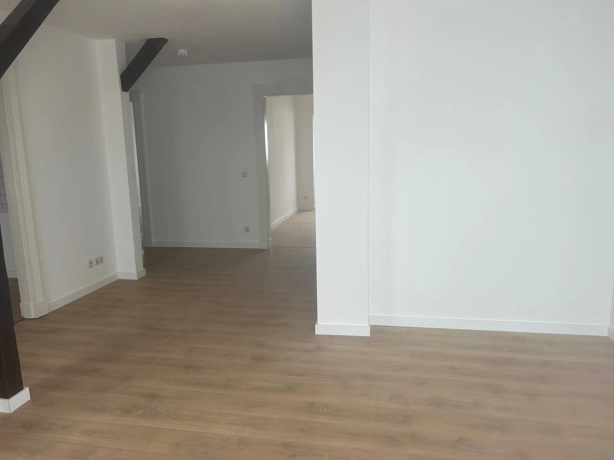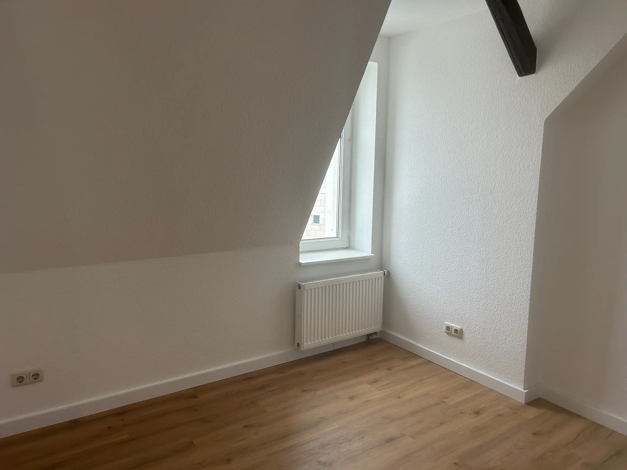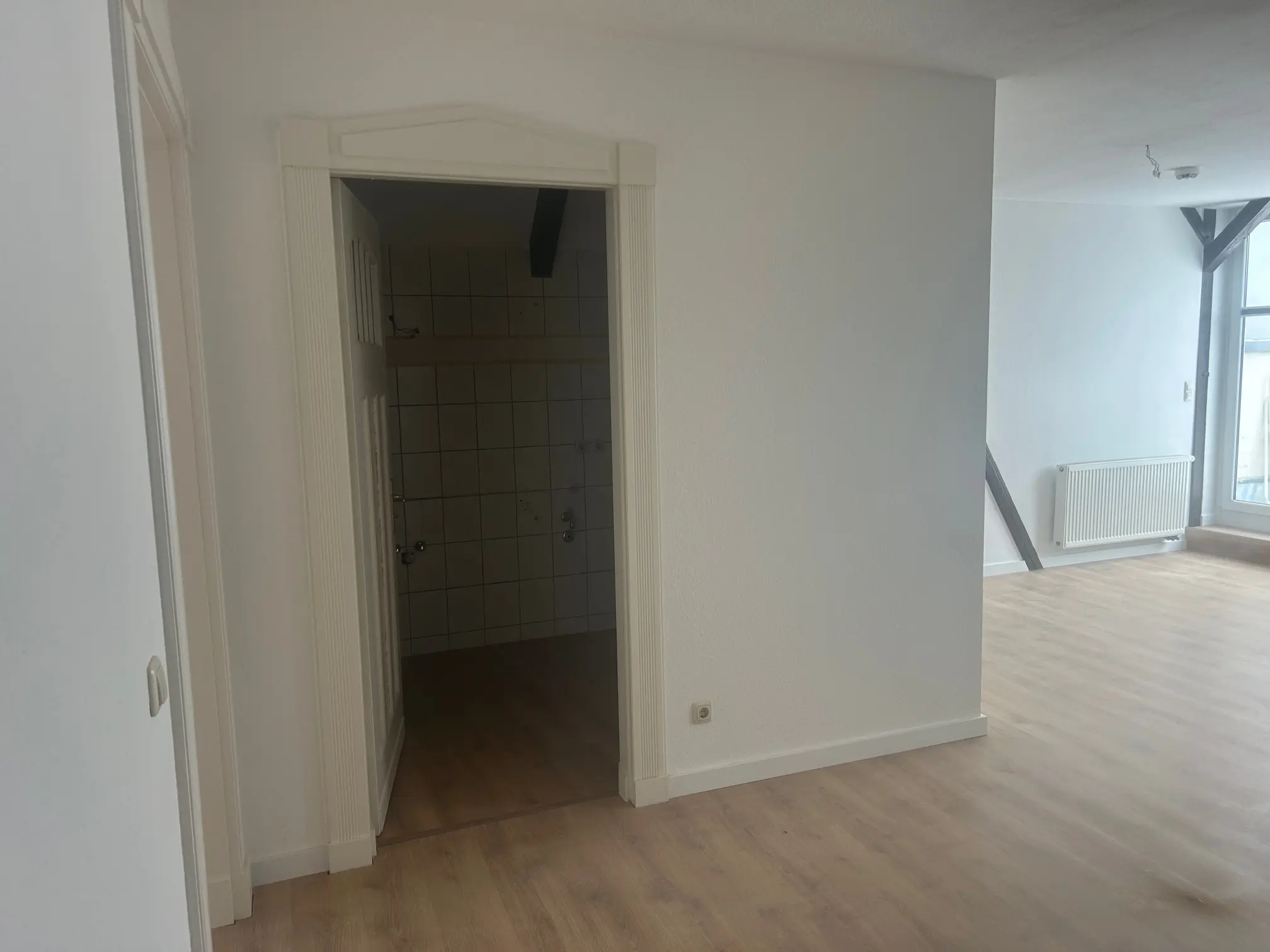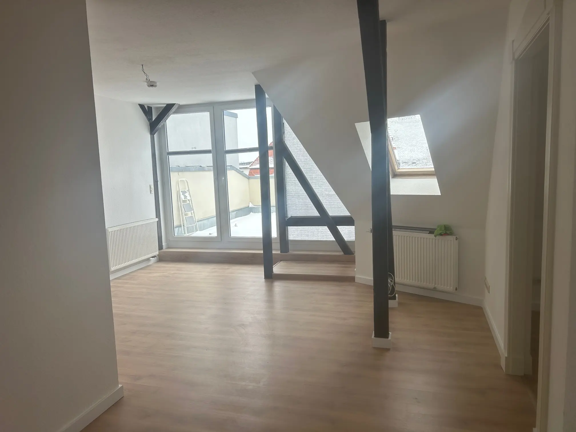 Diese frisch sanierte Dachgeschosswohnung mit großzügiger Dachterrasse und weitem Blick über Halle verbindet stilvollen Altbaucharme mit modernem Wohnkomfort. Das helle Wohnzimmer mit hochwertigem Vinylboden begeistert durch seine sichtbaren Dachbalken und schafft eine besondere Wohlfühlatmosphäre. Küche und Bad sind bequem vom Wohnzimmer aus erreichbar. Das innenliegende Bad verfügt über eine Badewanne, einen Handtuchheizkörper sowie ausreichend Platz für Ihre Waschmaschine.