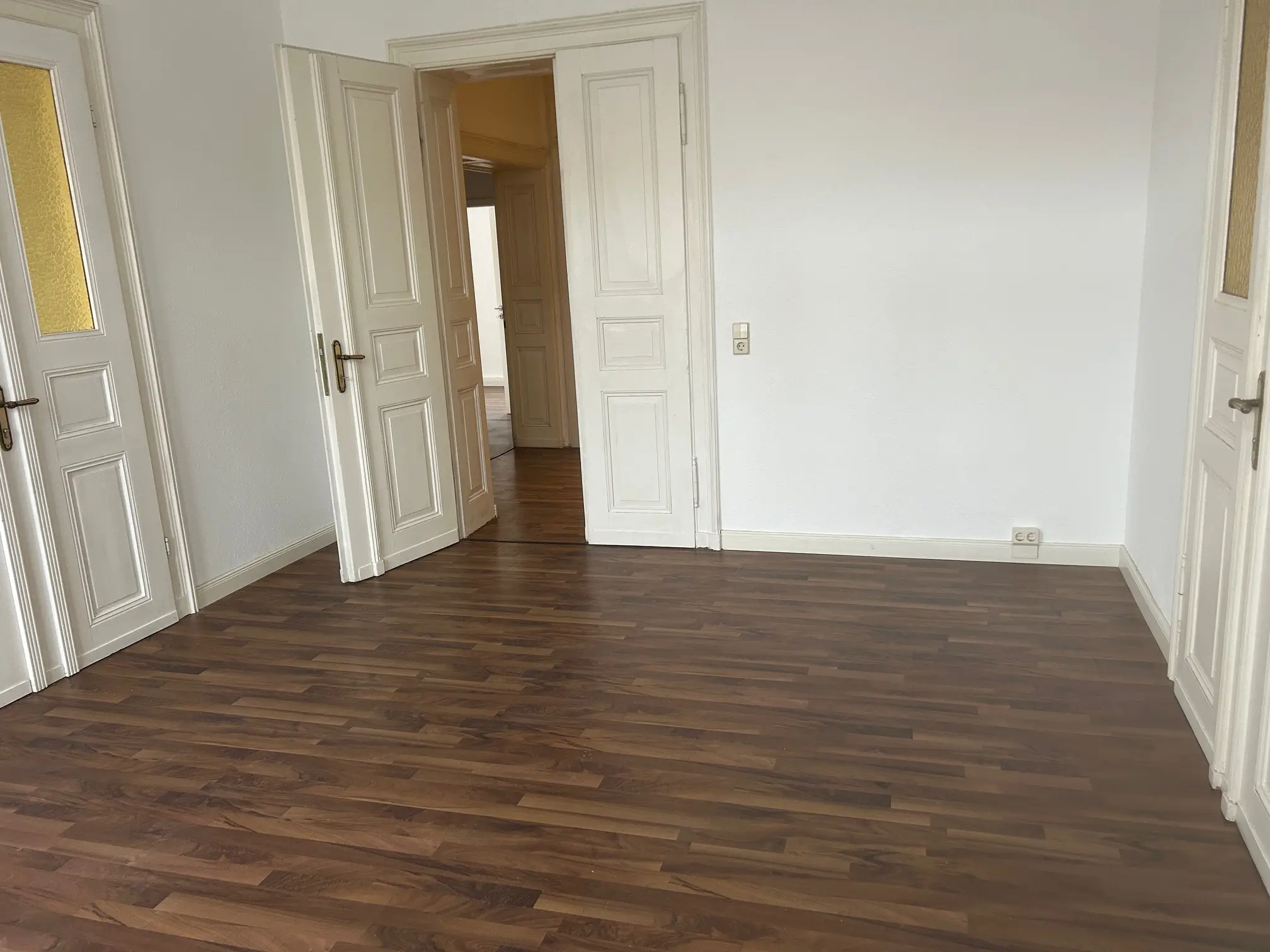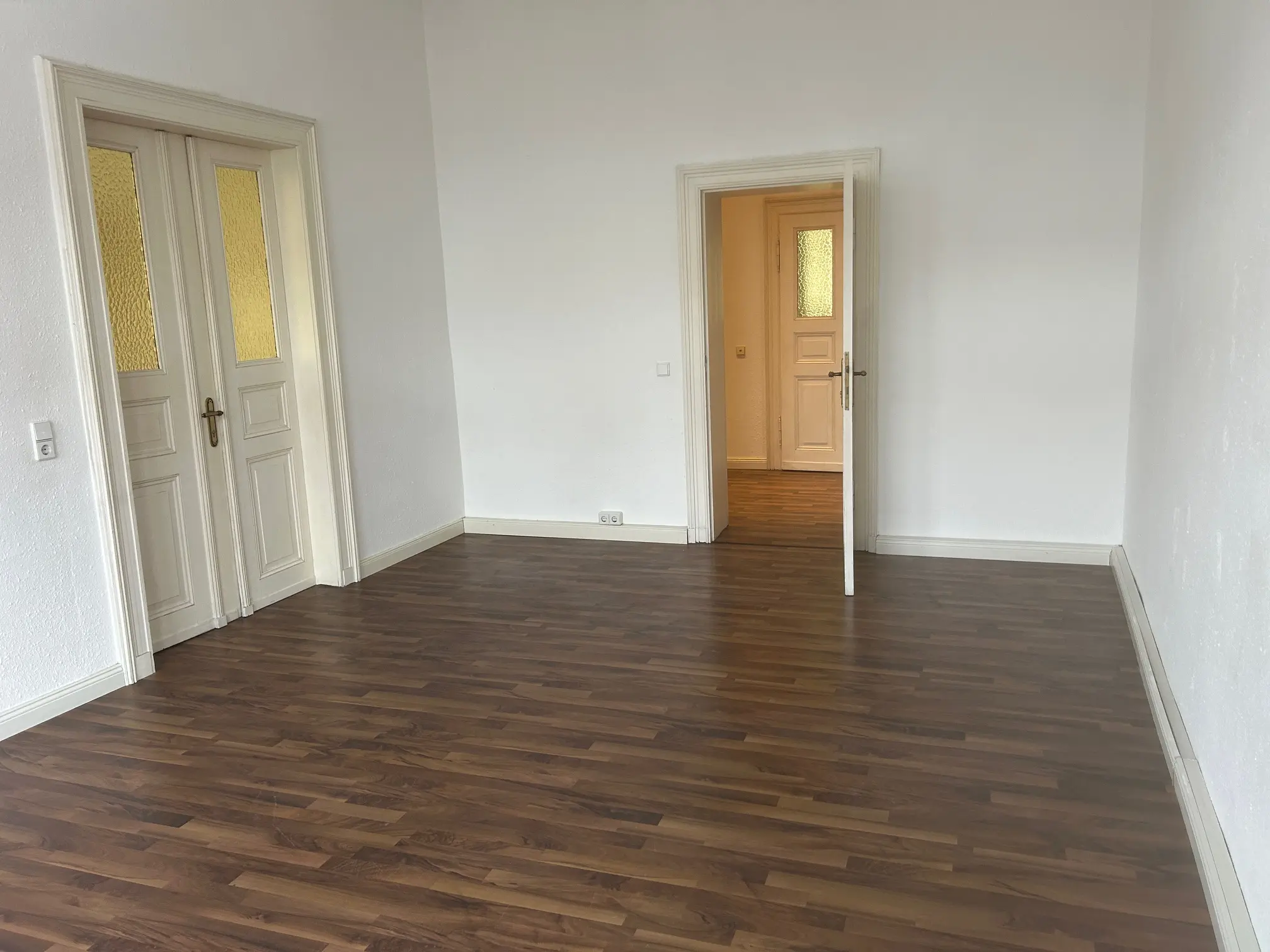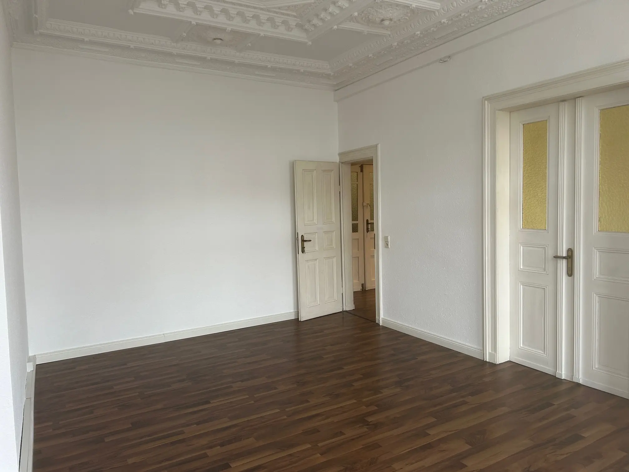 Die ca. 151 m² große Wohnung verbindet gepflegten Wohnkomfort mit dem besonderen Flair eines historischen Gebäudes. In den Wohnräumen sorgen Laminatböden und originale Holzinntüren für eine warme, authentische Atmosphäre, während weiße Raufaserwände ein helles und zeitloses Ambiente schaffen. Ein Balkon erweitert den Wohnraum ins Freie, und die historischen Holzfenster fügen sich harmonisch in das Altbauensemble ein. In einem der Räume setzt aufwendiger Stuck zudem einen stilvollen architektonischen Akzent.