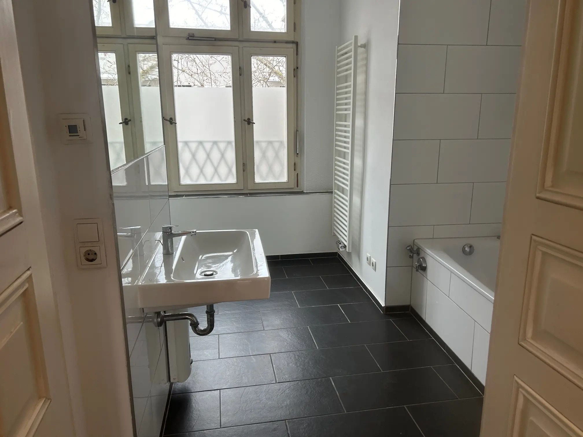 Die Wohnung verfügt über zwei Bäder: Das innenliegende Bad ist mit einer Dusche und einem Handtuchheizkörper ausgestattet und bietet funktionalen Komfort. Das großzügige Tageslichtbad überzeugt mit einer separaten, durch eine Tür abgetrennten WC-Zone, einer Badewanne, einem übergroßen Waschtisch, einem weiteren Handtuchheizkörper sowie einem praktischen Platz für die Waschmaschine.