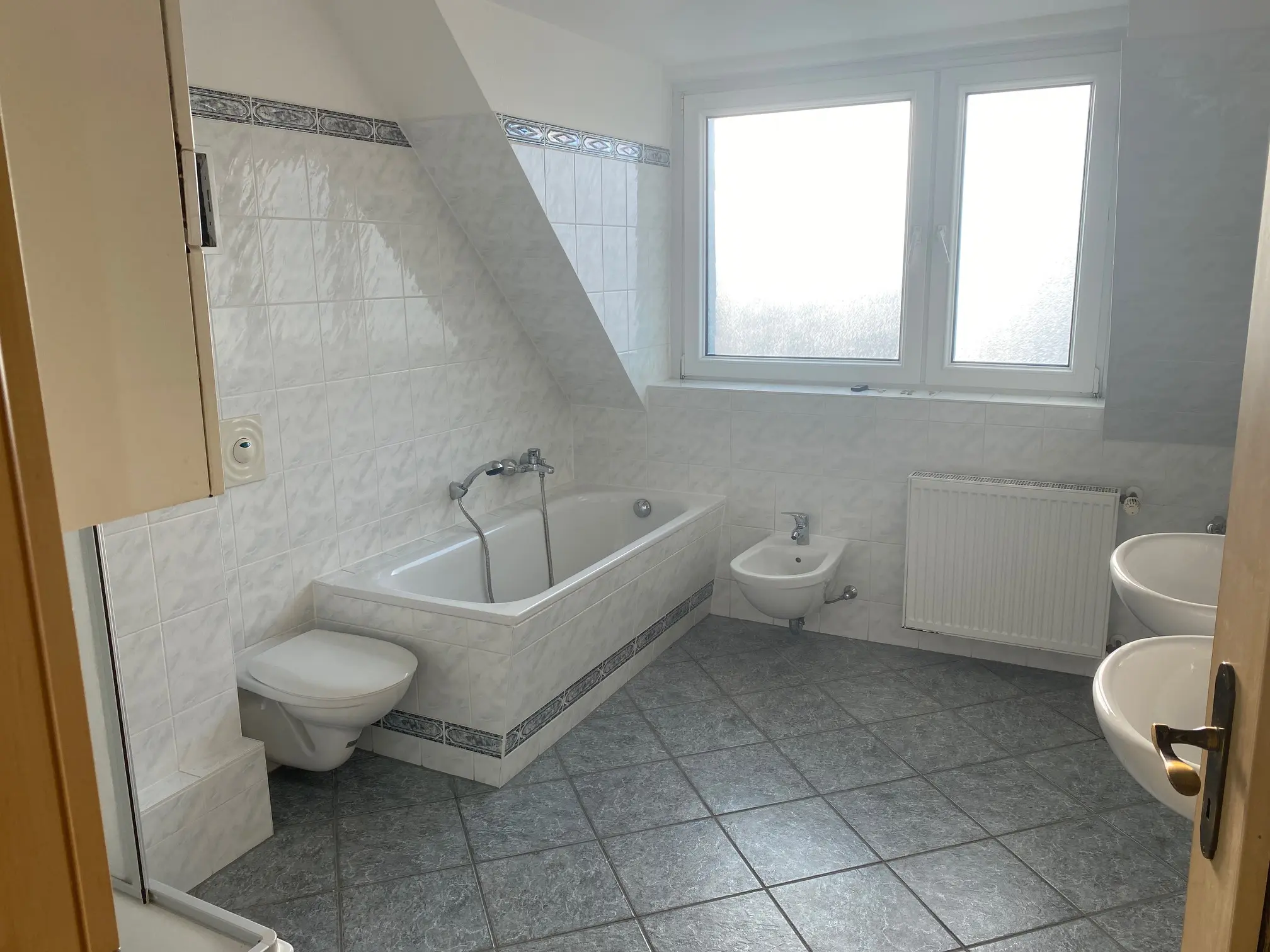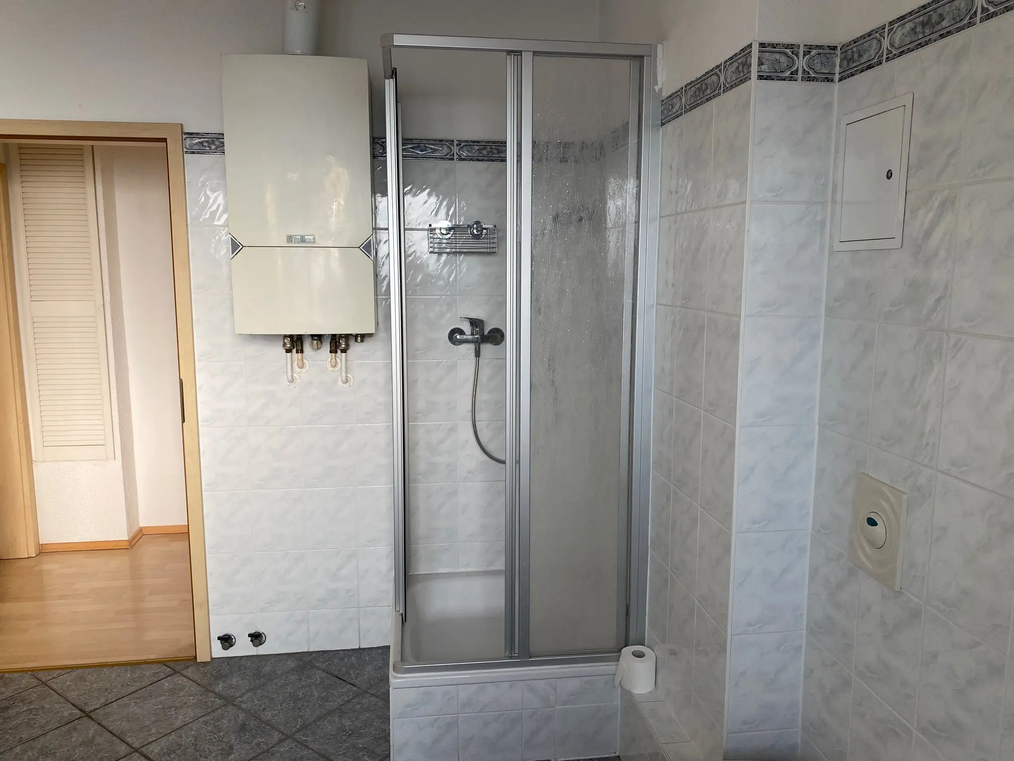Die Warmwasserzubereitung und Wärmeversorgung erfolgt über eine Gasetagenheizung, die sich ebenfalls im Bad befindet.