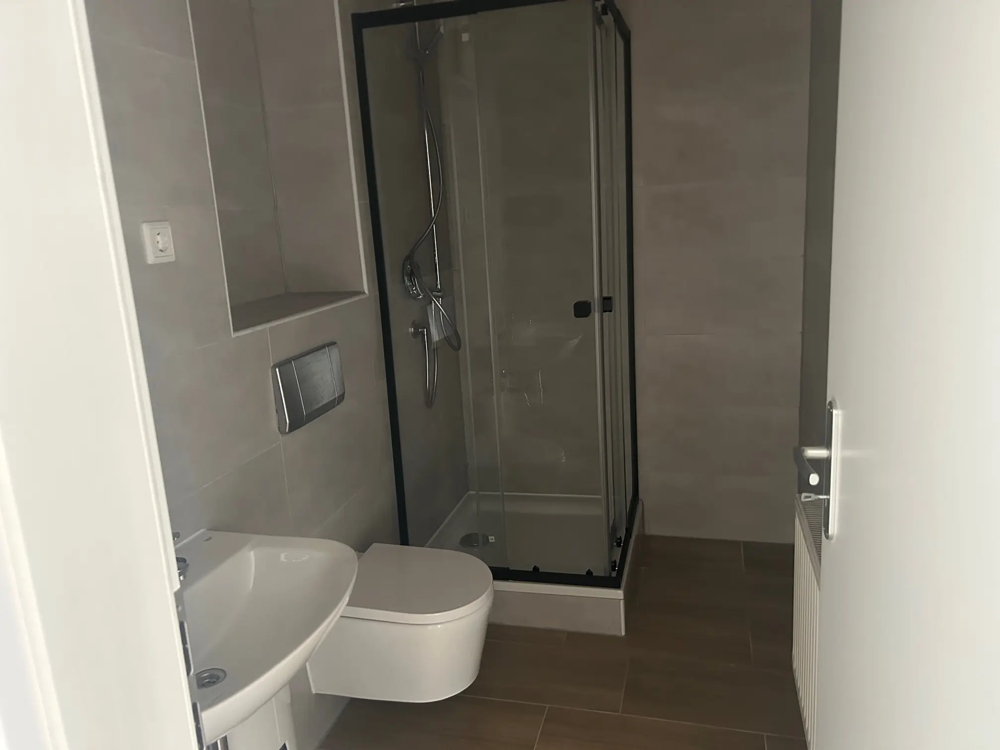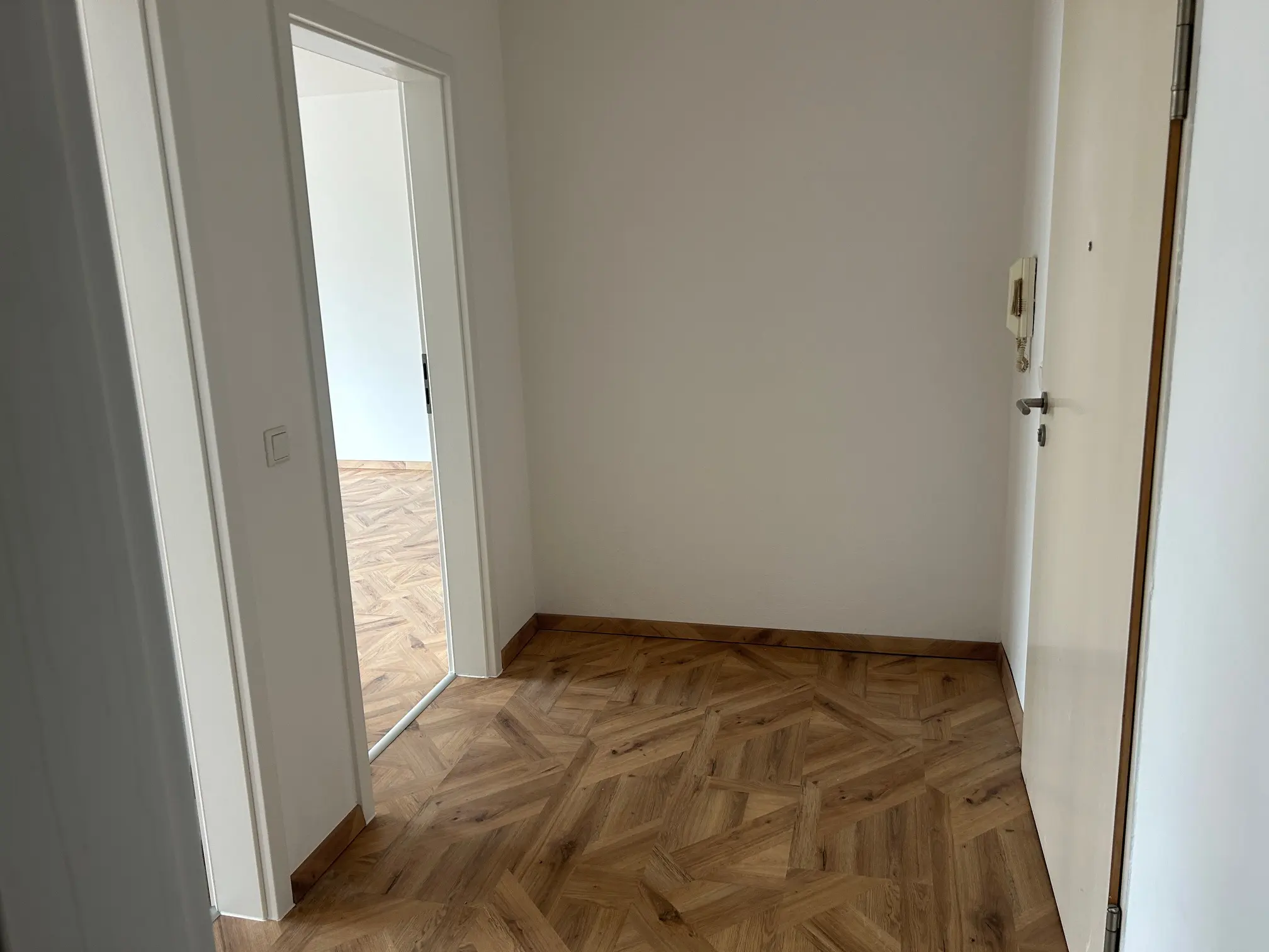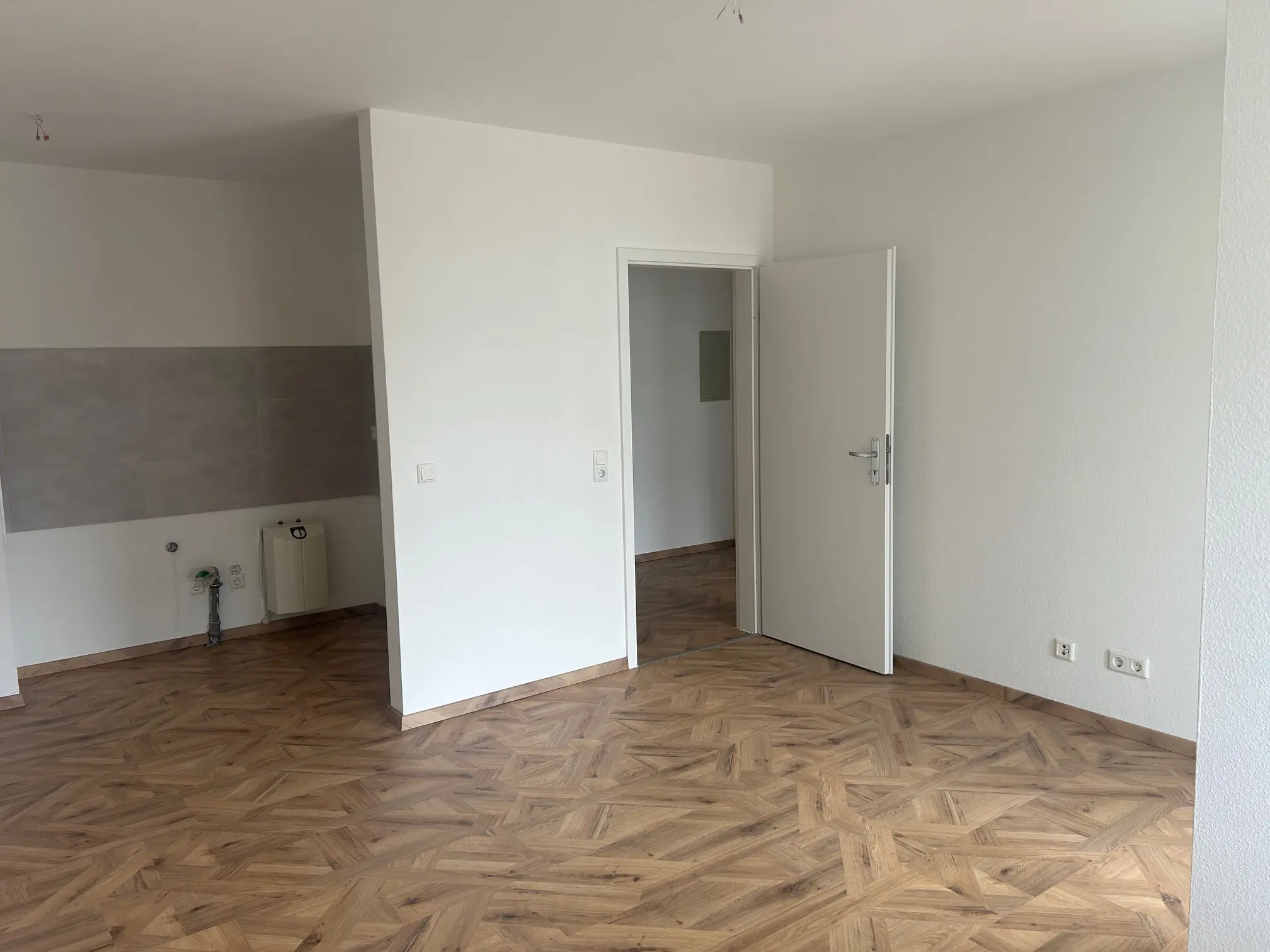 Das innenliegende Designerbad ist mit einer eleganten Regendusche sowie einer praktischen Abstellnische ausgestattet. Weiße Innentüren unterstreichen das moderne Gesamtbild der Wohnung. Die offene Küche am Wohnzimmer verfügt über einen Fliesenspiegel sowie einen Boiler, während ein Durchlauferhitzer die Warmwasserversorgung effizient ergänzt.