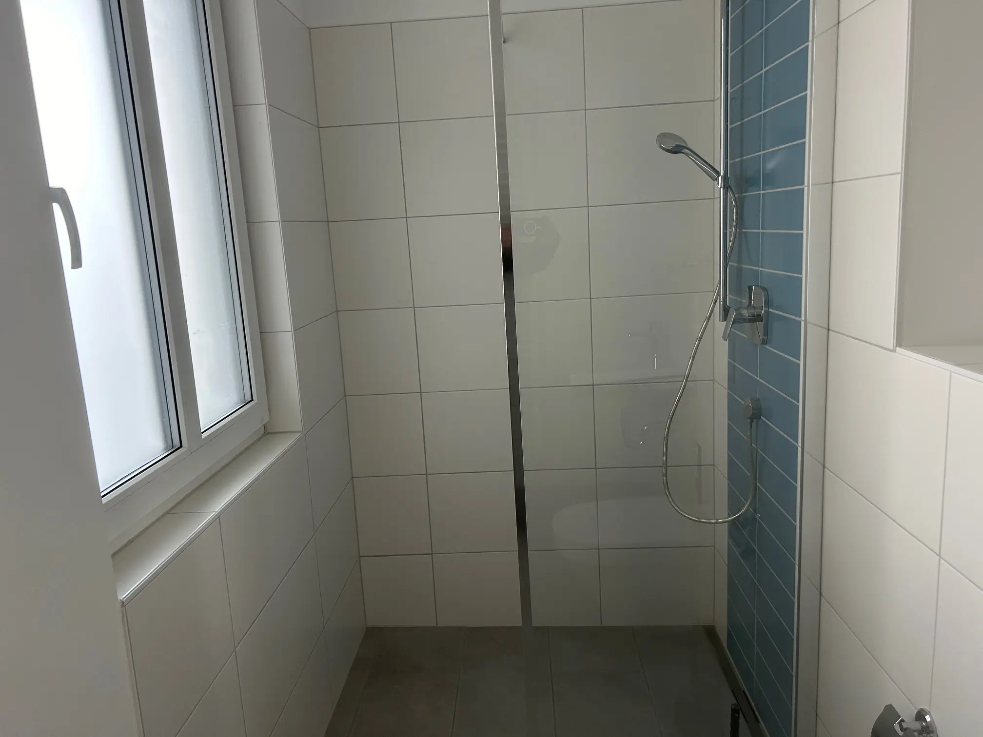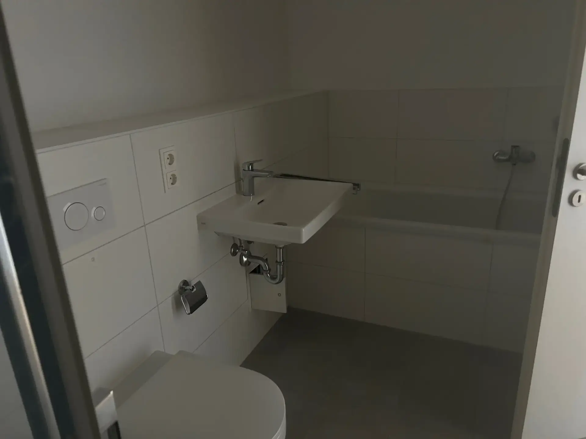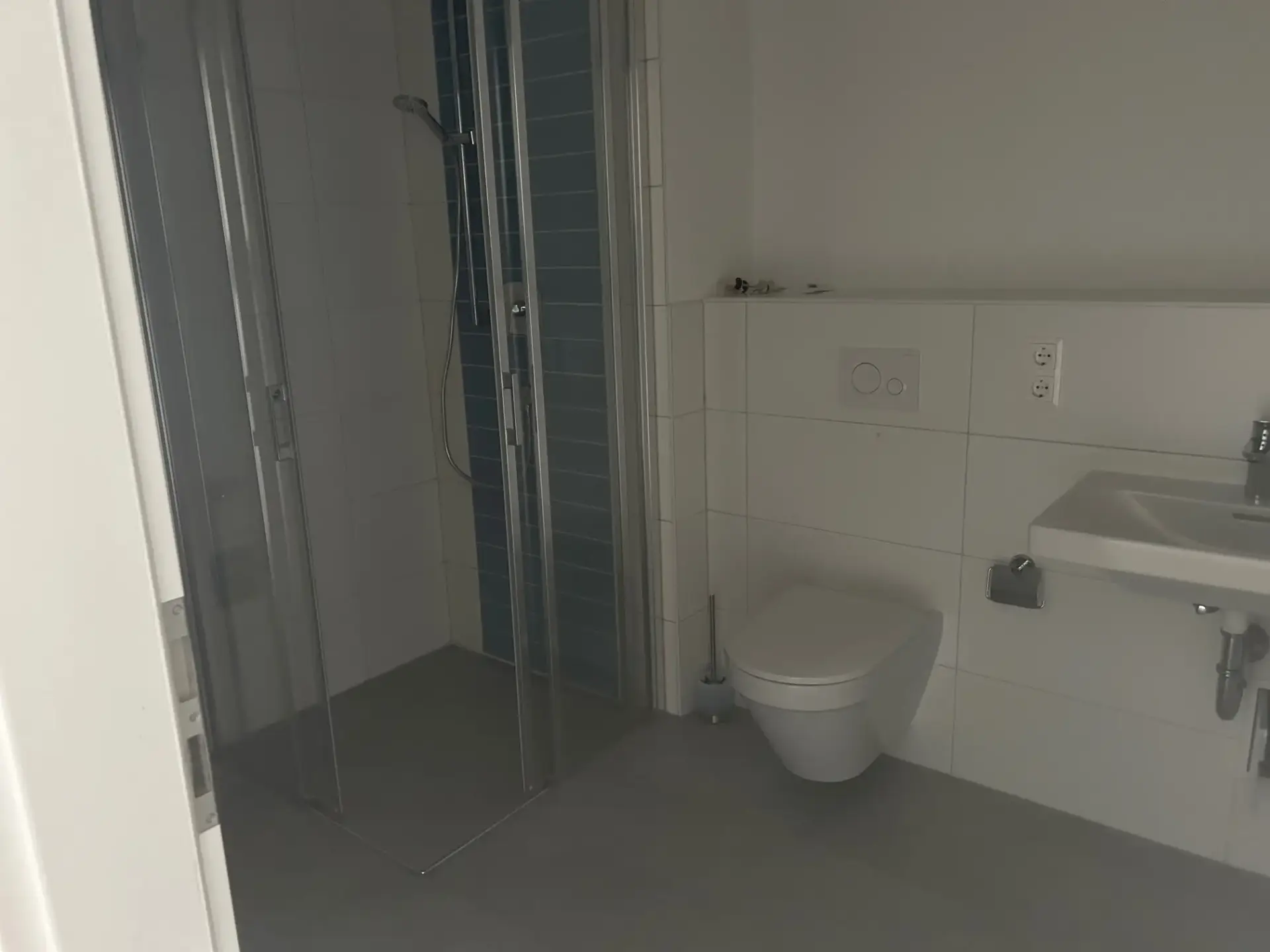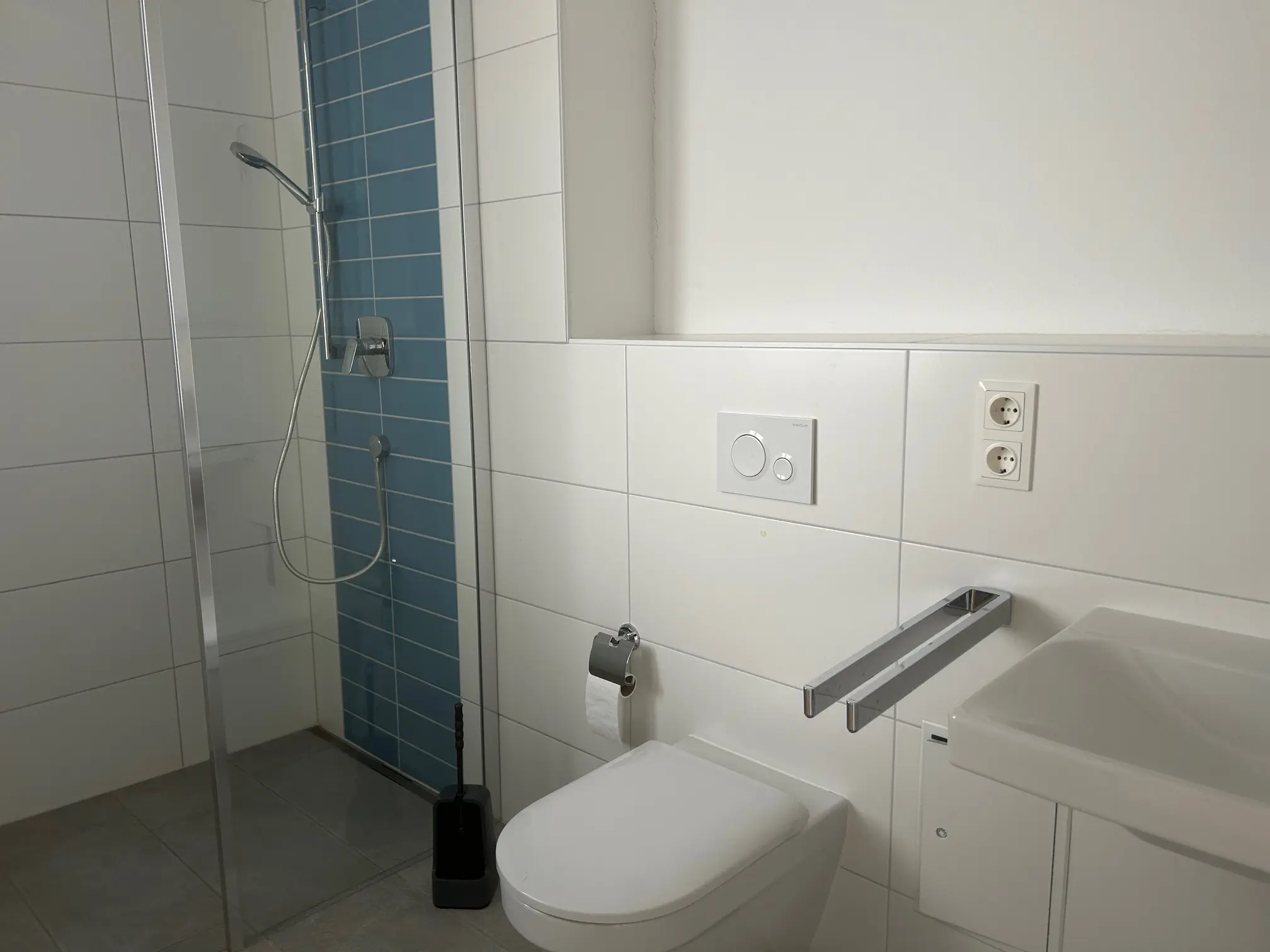 Das edle Designerbad überzeugt mit einer bodengleichen Dusche samt Glasabtrennung, einer eleganten Badewanne, einem wandhängenden WC, einem stilvollen Waschtisch sowie einem praktischen Anschluss für Ihre Waschmaschine. Ein separates Gäste-WC bietet zusätzlichen Komfort.
