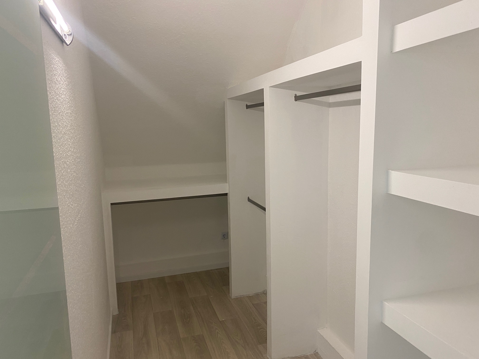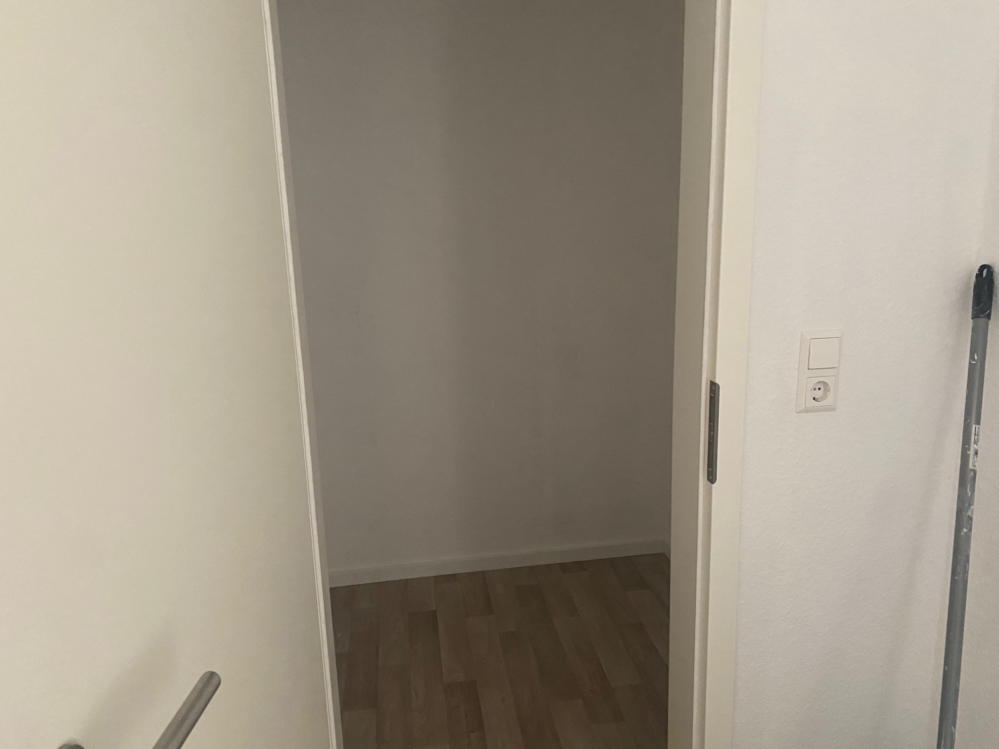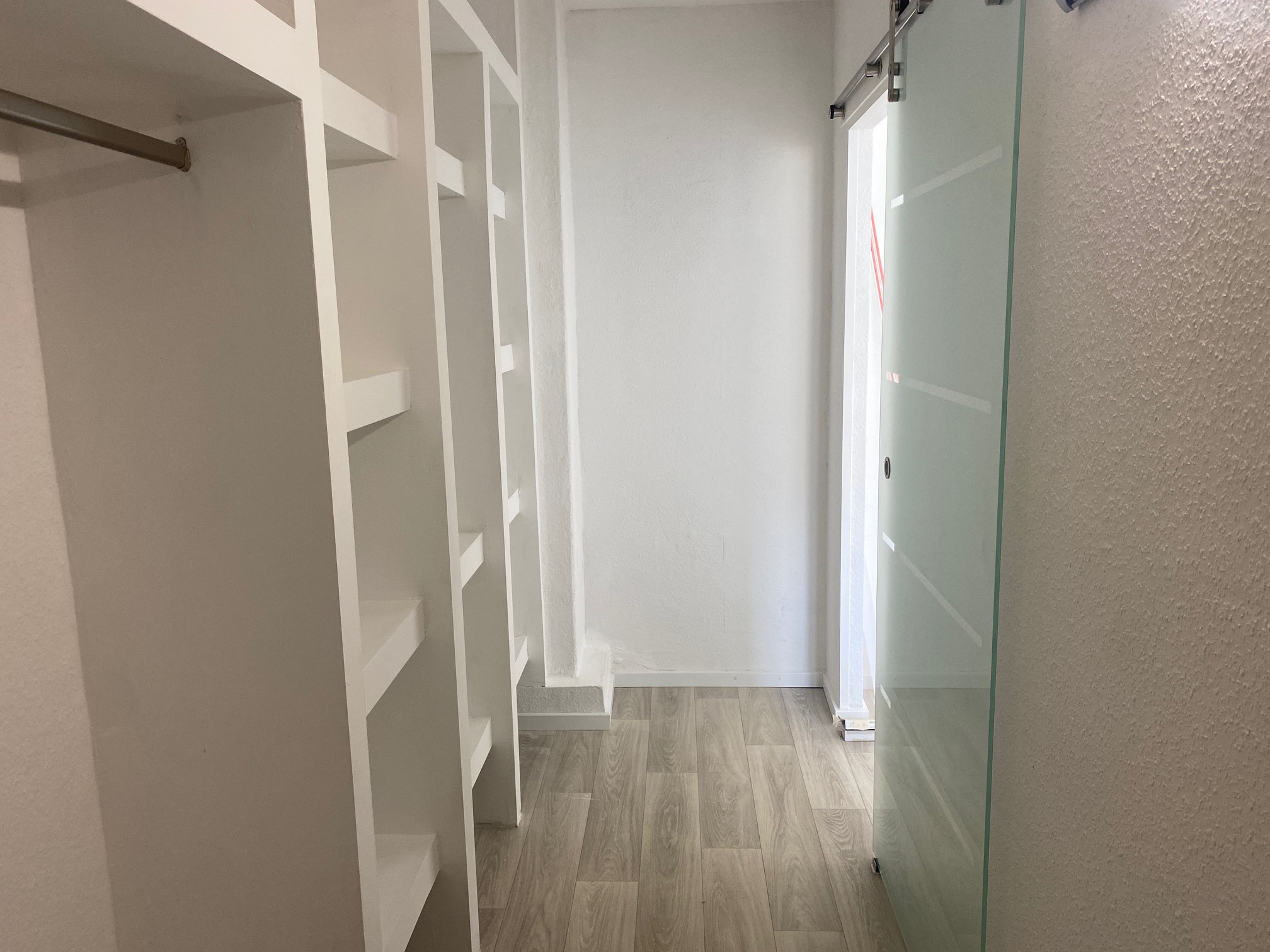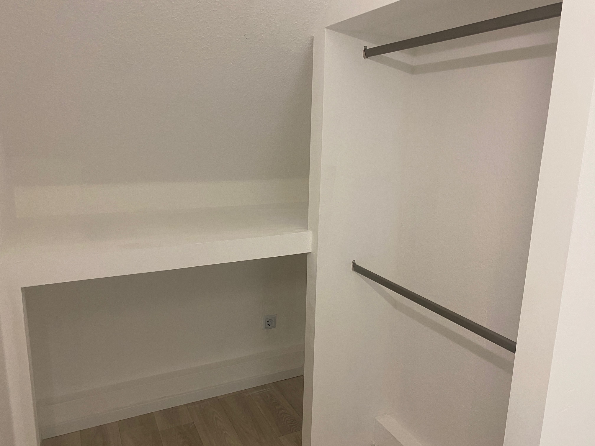 Im Flur wurde ein praktischer Abstellraum geschaffen. Vom Schlafzimmer aus gelangen Sie in einen geräumigen, begehbaren Kleiderschrank mit eleganter Glasschiebetür – ein echtes Highlight für alle, die viel Platz für Kleidung und Accessoires schätzen.