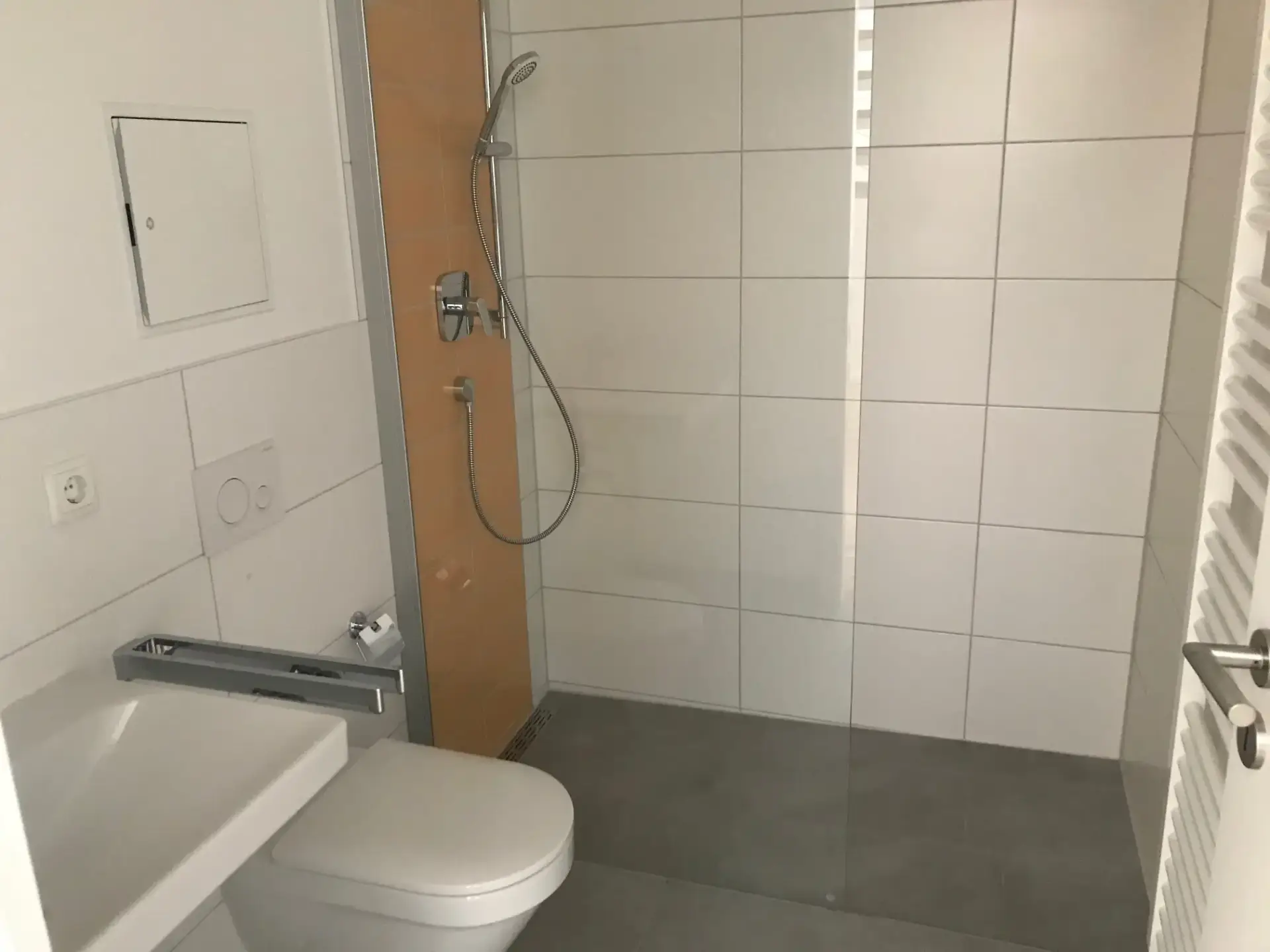 Ein echtes Highlight ist das großzügige Designerbad mit Tageslicht im unteren Geschoss – ausgestattet mit moderner Badewanne, Hänge-WC und elegantem Waschtisch. Im Dachgeschoss erwartet Sie ein weiteres Bad mit einer bodengleichen Dusche – ideal für komfortables Wohnen auf zwei Ebenen.