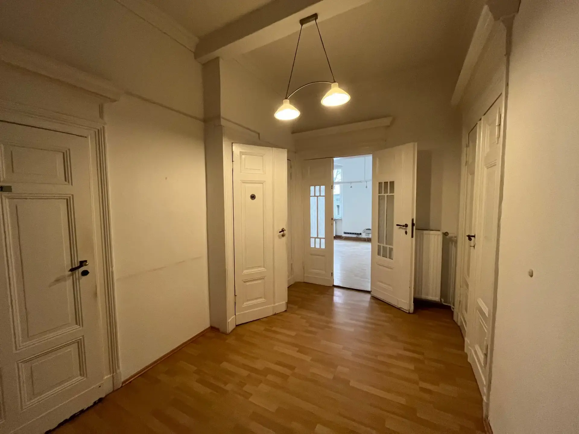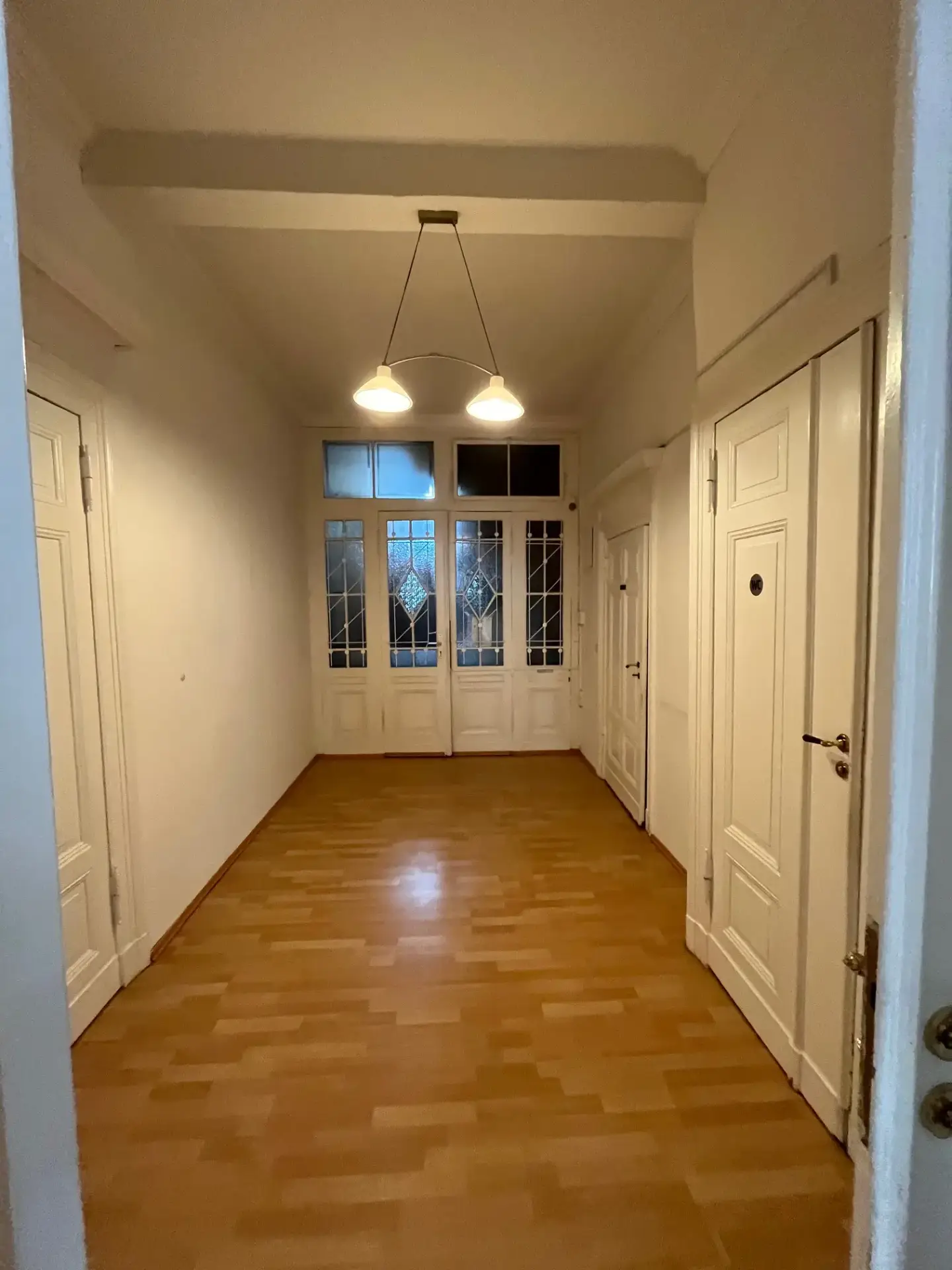 Zwei Bäder sowie ein großzügiger Kellerraum stehen ergänzend zur Verfügung. Charaktervolle Holztüren, hohe Decken – teilweise mit stilvollem Stuck – und ein eleganter Echtholzfußboden schaffen ein besonderes, angenehmes Ambiente mit historischem Charme.
