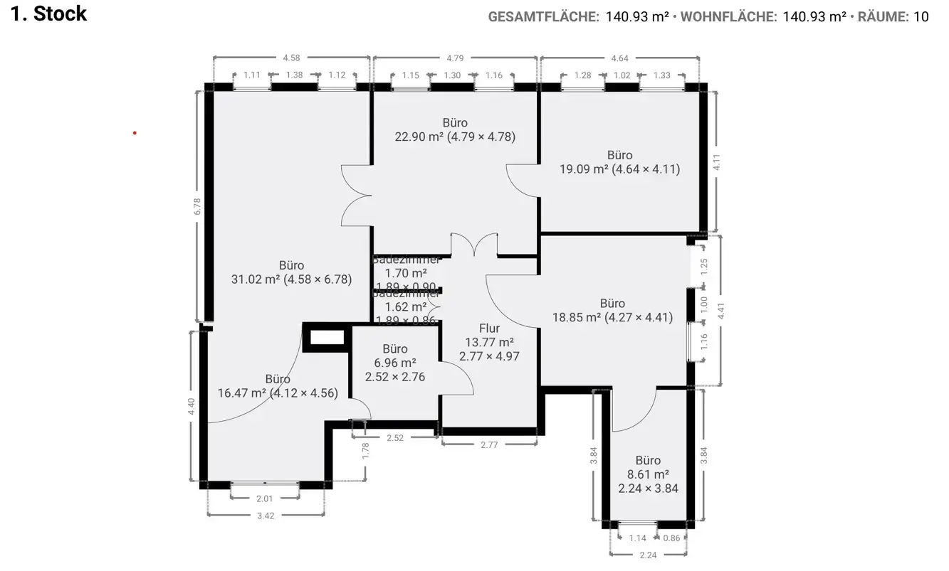 Die Gewerbeeinheit überzeugt durch eine hochwertige Ausstattung mit Parkett-, Laminat- und Fliesenböden. Der außergewöhnliche Grundriss eröffnet vielfältige Möglichkeiten zur flexiblen Raumaufteilung und eignet sich ideal für eine repräsentative Büro- oder Praxiskonzeption.